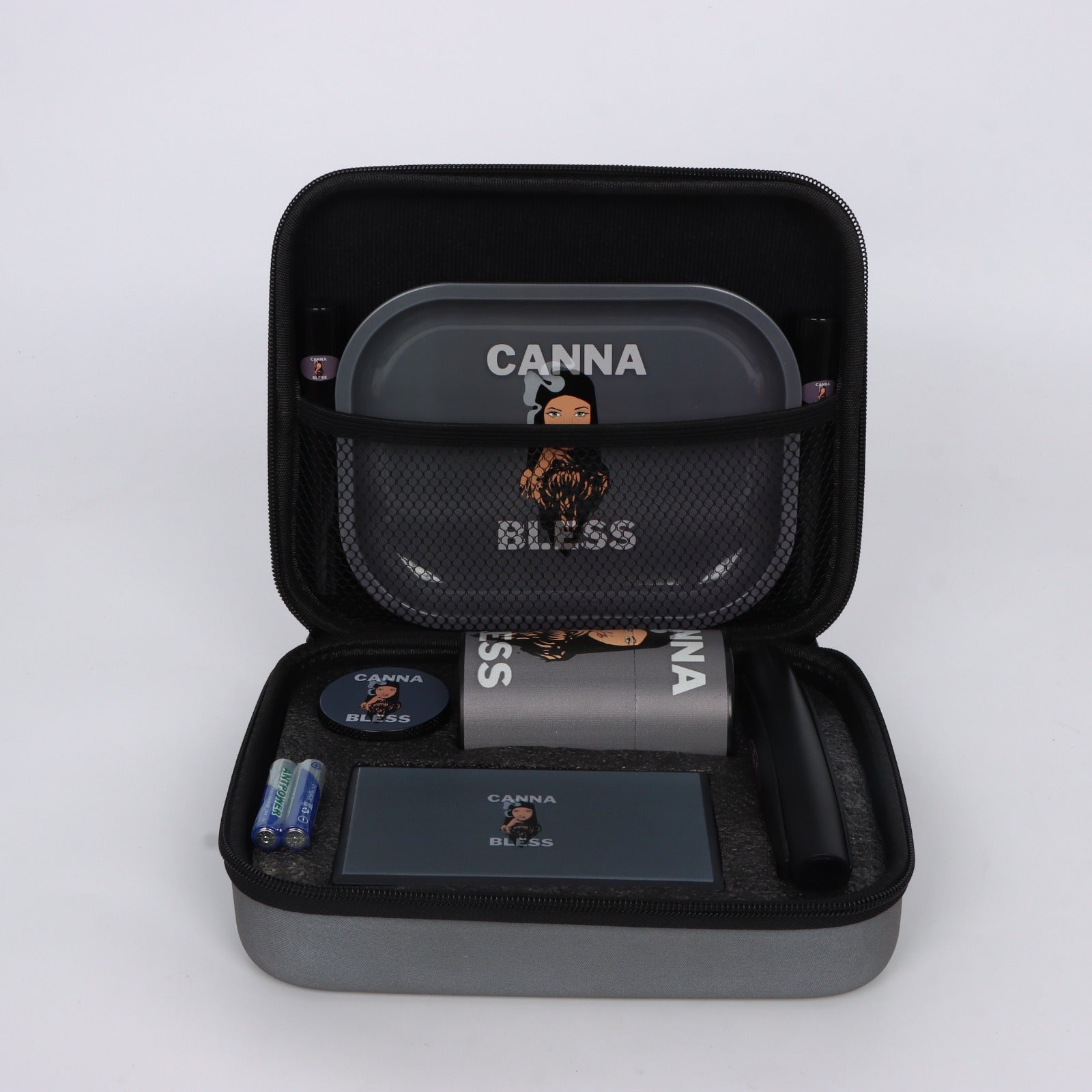 Diese durchdachte Tasche hat alles, was du brauchst: einen hochwertigen Grinder, einen stabilen Table für die Zubereitung, eine vakuumversiegelte Box zur sicheren Aufbewahrung, eine präzise Waage für exakte Messungen, eine benutzerfreundliche Rollmaschine und zwei stylishe Hüllen für deine Essentials.